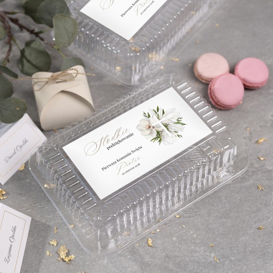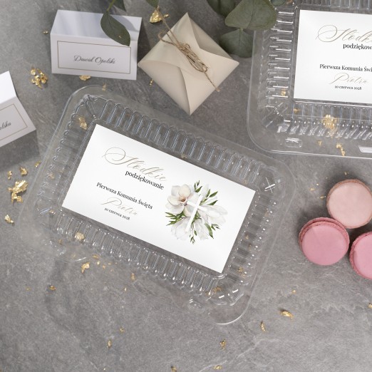 Samoprzylepne etykiety na pudełka na ciasto, to najprostszy i najtańszy sposób na stworzenie pięknej dekoracji komunijnej.