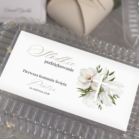 Na etykiecie nadrukowany jest grafika kwiatów i krzyża, a także data, napis „Pierwsza Komunia Święta” oraz imię pierwszokomunisty. Ten sam wzór pojawia się również w zaproszeniach № 1 z tej samej kolekcji, tworząc spójną i elegancką oprawę uroczystości.